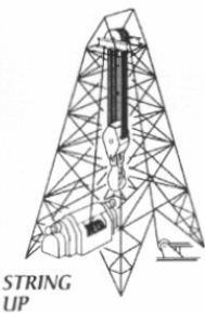 v: to thread the drilling line through the sheaves of the crown block and traveling block. One end of the line is secured to the hoisting drum and the other to the derrick substructure.